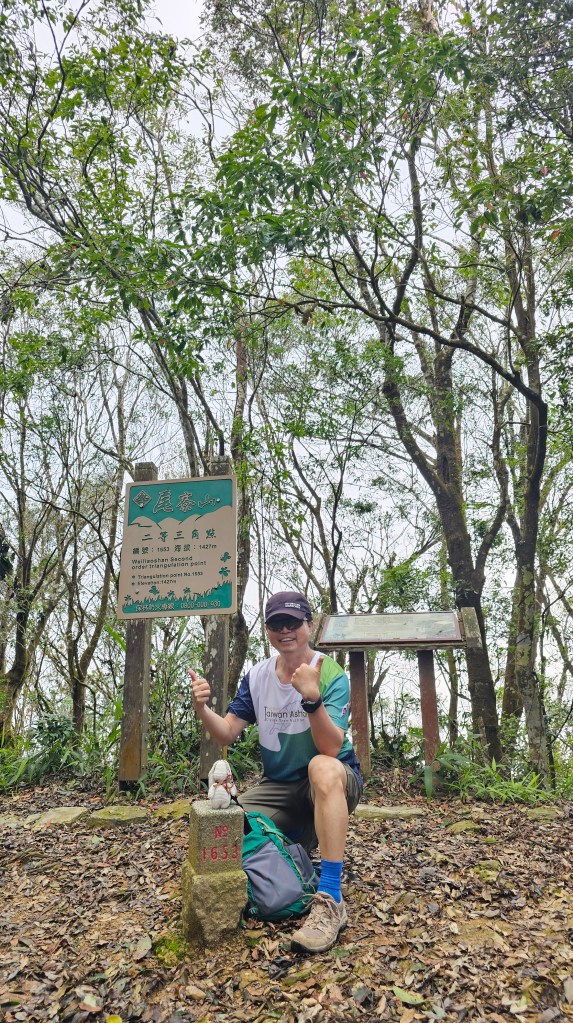 240421二走尾寮山5hr50m。時隔一年兩個月,假日本想比翼雙飛,神隊友簡單明確回覆NO。少了神隊友,單飛起來特別無趣。四月水要帶足夠,登山杖可以充當第三隻腳,多帶一套衣物,全身濕透時可替換,免得感冒,手套備用,因為偶爾需要拉繩。爬升1250公尺不打緊,來回16公里才要命,6到8小時是常人,哥今天非常人。