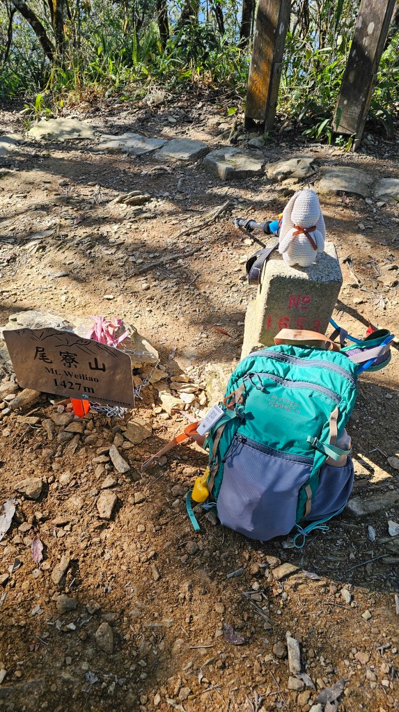 第一刷的兩人裝備與第九探一人獨行截然不同。除裝備減為一人外,更因預期天氣OK,冬天清晨氣溫稍低帶超輕量防風衣一件,下雨完全沒功能;自拍桿、口糧都沒帶。水減少至2.5公升,帶上美美兔、濕紙巾、行動電源、日本安摩樂、遮陽帽、小手巾、登山杖一支,足矣。以上僅是個人經驗供參考,初攀尾寮山或登山經驗少者仍須衡量自身需求與體能。