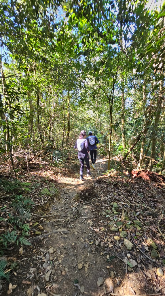 第八攀總算拍到兩位跑山友英姿。尾寮山6.2K以後一路多階梯陡上(硬菜一大碗)經過海拔900休歇亭,7K路標就在前方不遠處,但也從此處開始到9K間的階梯或山徑上多濕滑,放慢腳步才能保平安。第九探潮濕感更重些。