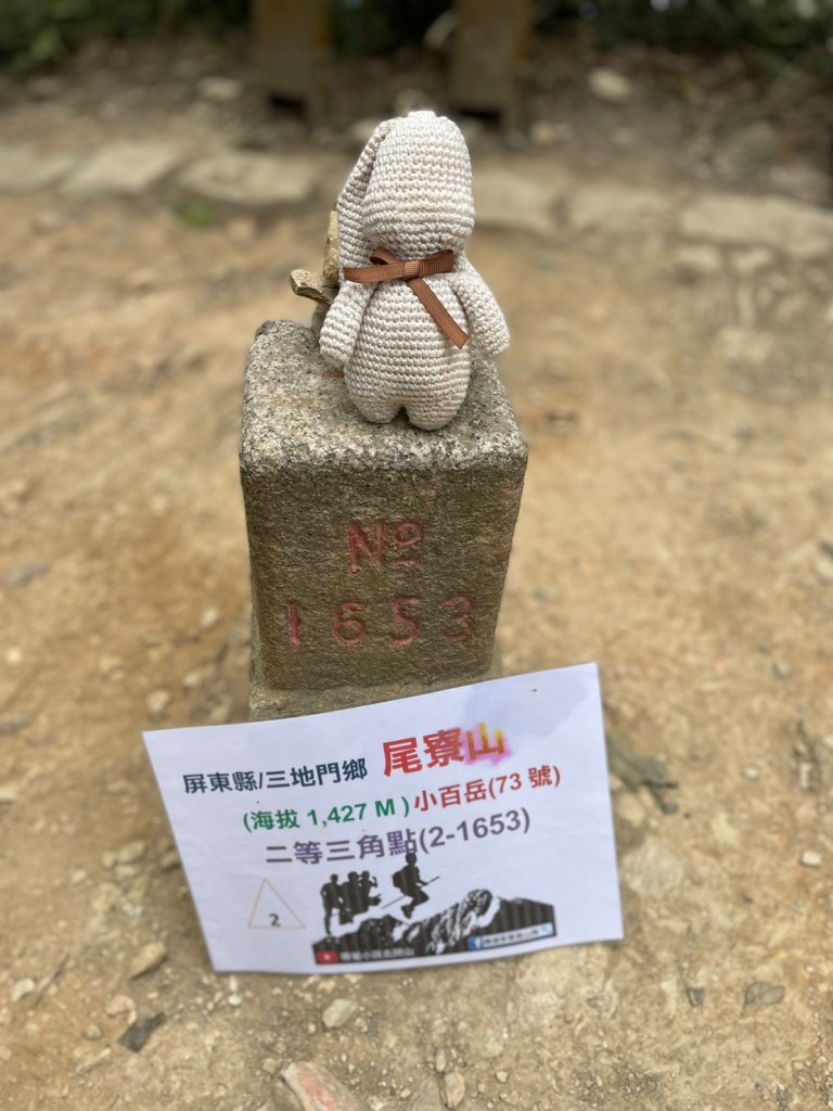 九探魔王小百岳#073尾寮山。尾寮山位在屏東縣三地門鄉及高雄縣茂林區交界, 步道前半段為產業道路,循之字形緩坡向山上。之後,步道轉為較原始之登山山徑,兩旁為低海拔闊葉林。後段路徑長、坡度陡,偶有拉繩輔助攀登,在小百岳中是挑戰級路線,可惜的是山頂為二等三角點無展望。