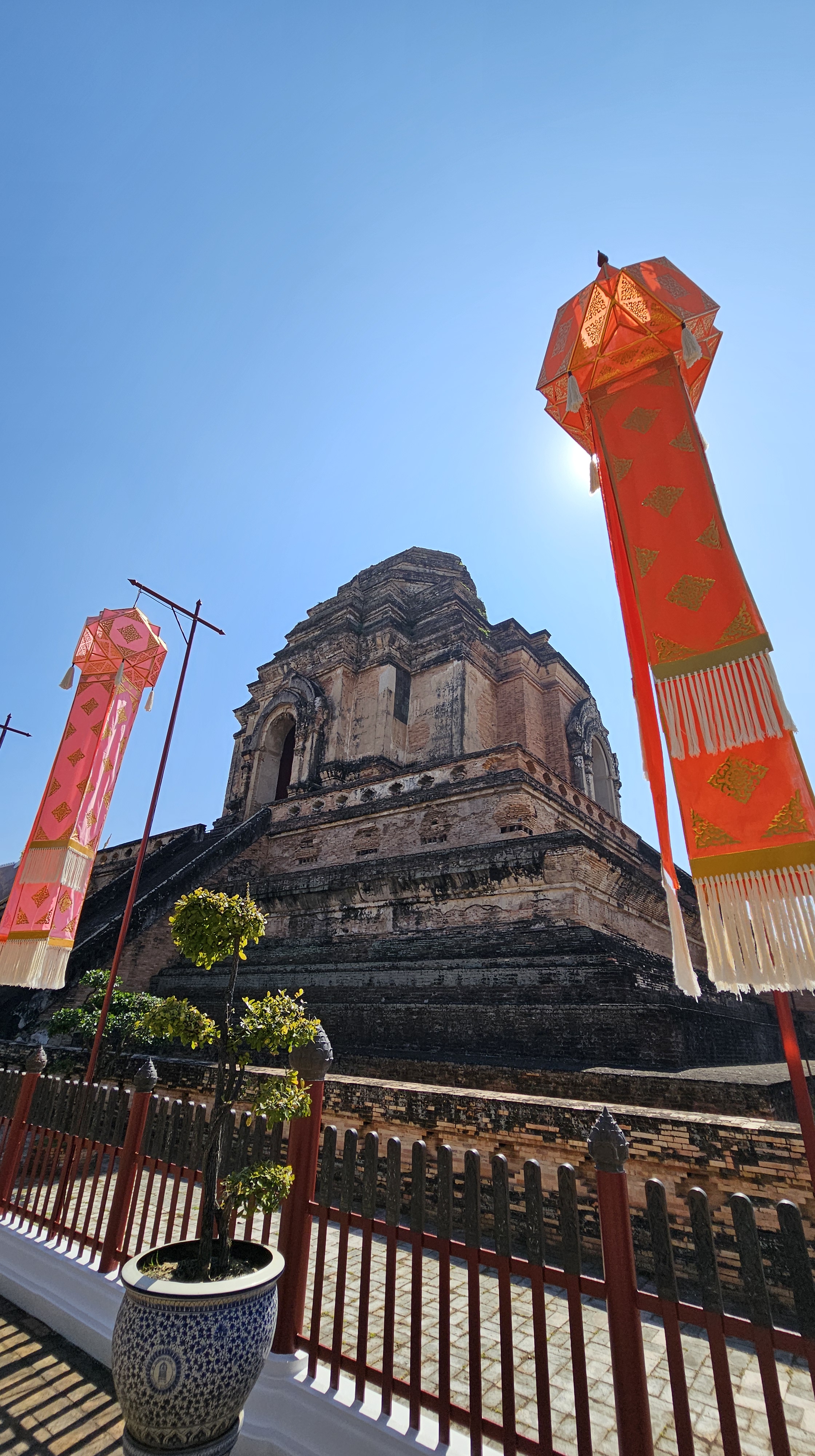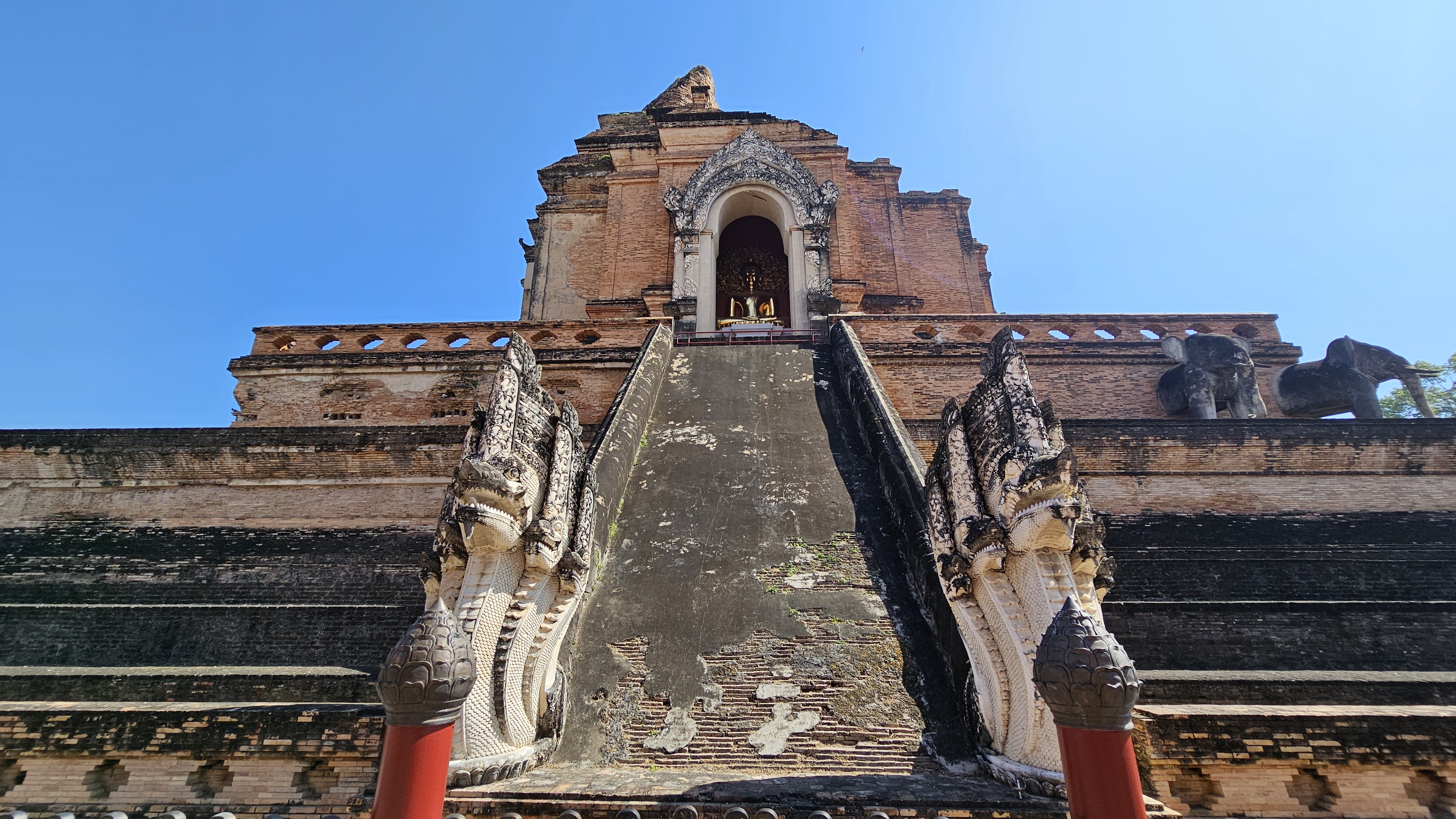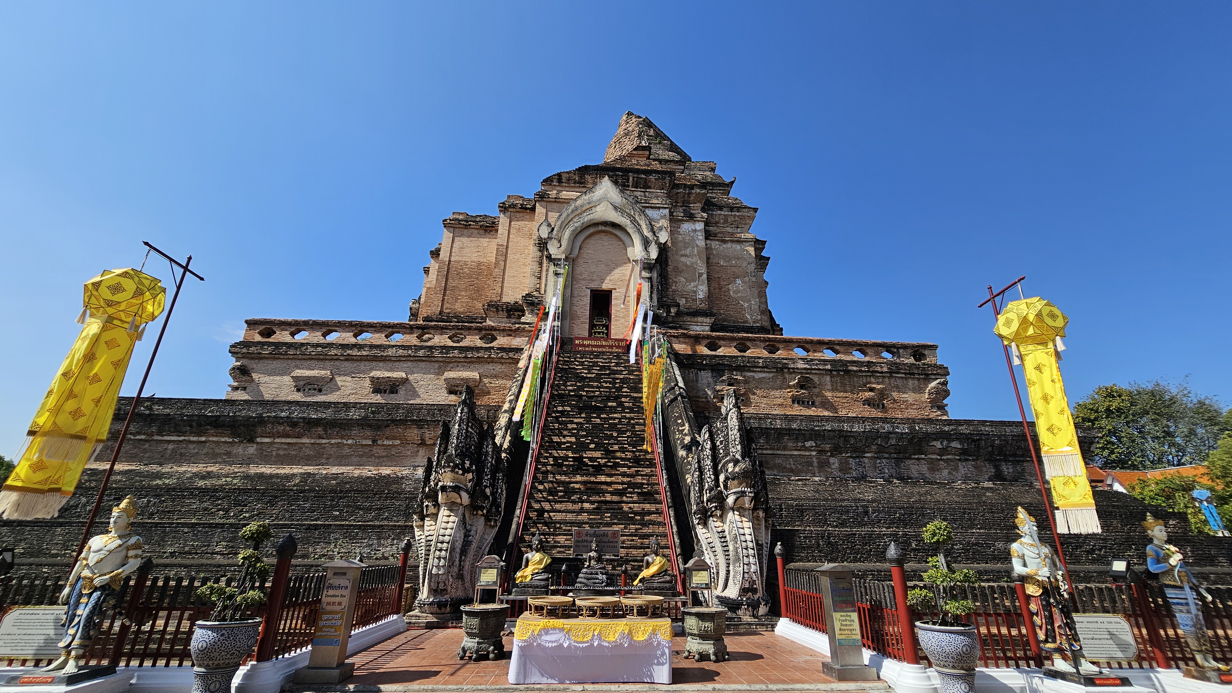 「柴迪隆寺」(大塔寺)位於古城正中央,建造於1411年,是清邁最重要的佛寺,也是清邁六大寺廟中最廣為人知的一座!融合印度、錫蘭風格的佛塔原高98米,曾是泰北最高建築,歷經大地震、泰緬戰爭砲火及雷電襲擊,現今只剩下42米高的塔基和首層。然而幾百年過去,仍是清邁古城最高聳的建築。